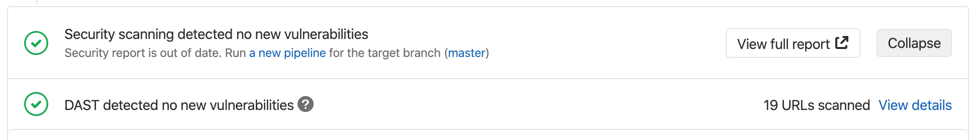 NOTE: A pipeline may consist of multiple jobs, including SAST and DAST scanning. If any job fails to finish for any reason, the security dashboard doesn't show DAST scanner output. For example, if the DAST job finishes but the SAST job fails, the security dashboard doesn't show DAST results. On failure, the analyzer outputs an exit code.