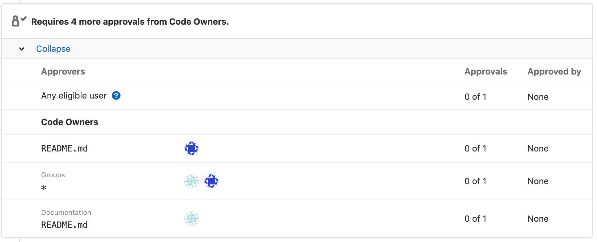 NOTE: For approval to be required, groups as Code Owners must have a direct membership (not inherited membership) in the project. Approval can only be optional for groups that inherit membership. Members in the Code Owners group also must be direct members, and not inherit membership from any parent groups.