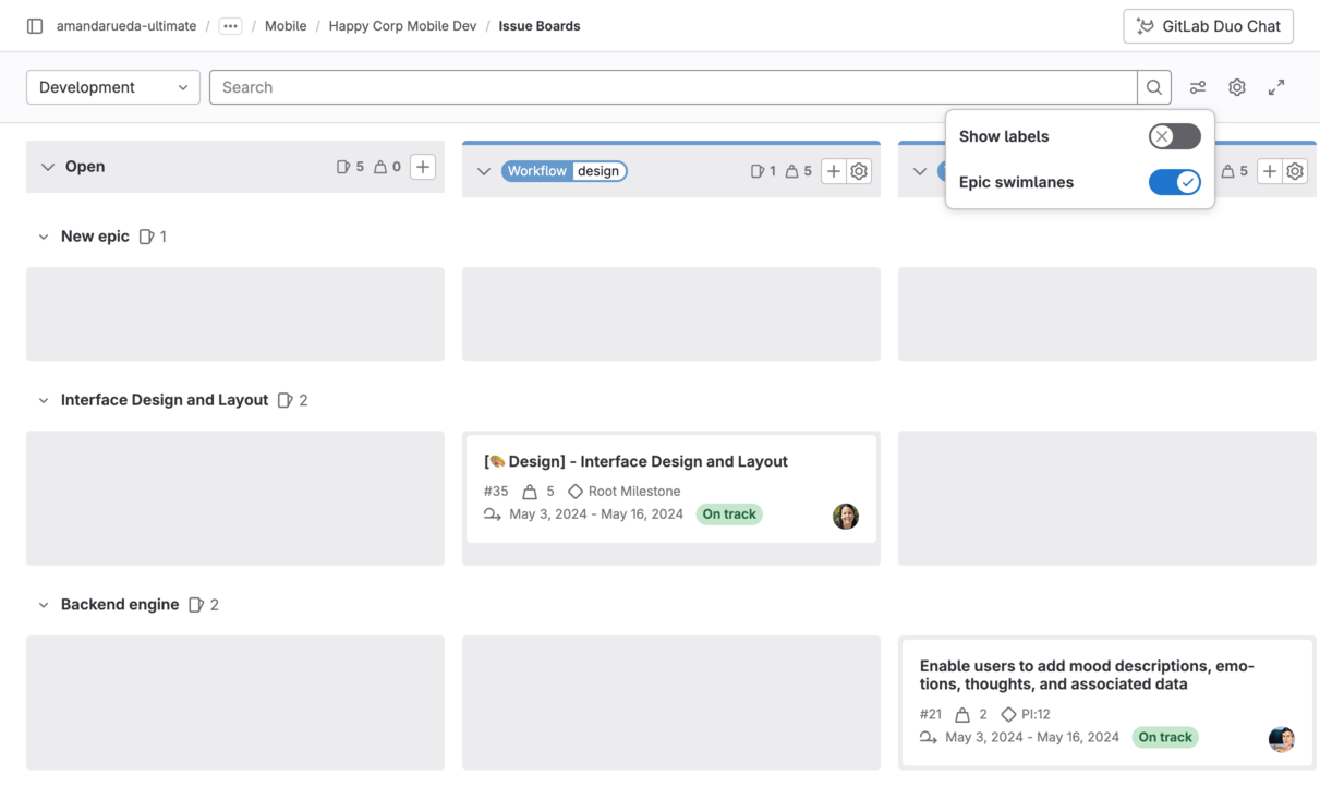 For a tutorial how to set up your boards in a similar way with scoped labels, see Tutorial: Set up issue boards for team hand-off.