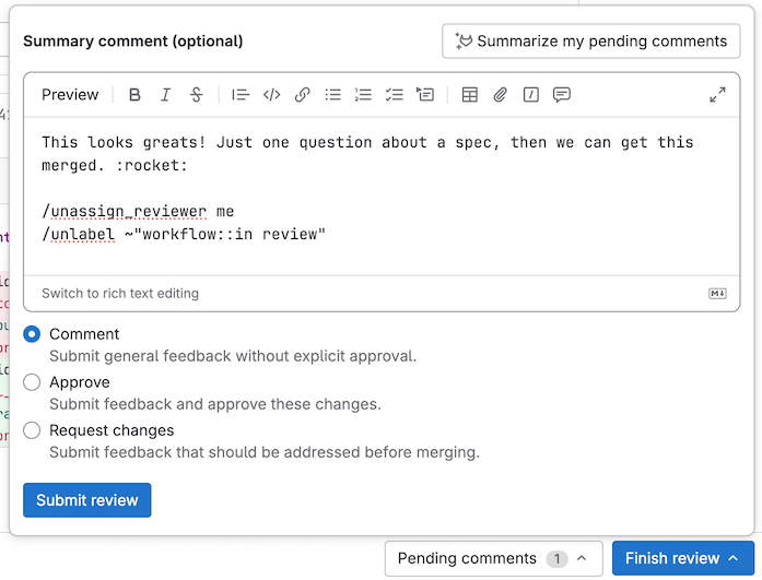 Select Finish review, then select Submit review at the bottom of the dialog. In the dialog, you can supply a Summary comment, approve (or reject) the merge request, and include quick actions: